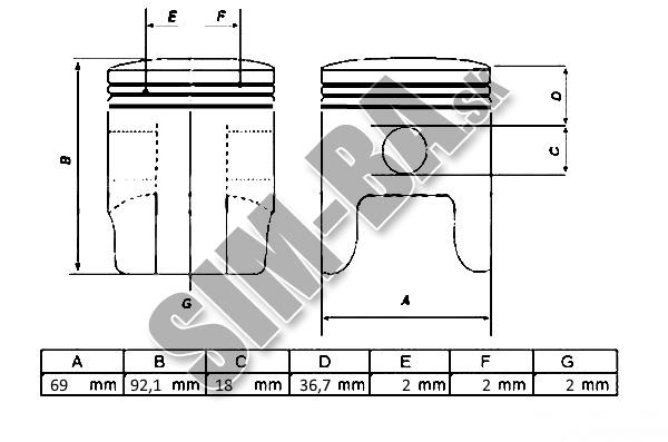 /1 ks piest, 3 ks piestný krúžok, 1 ks piestný čap, 2 ks poistný krúžok/